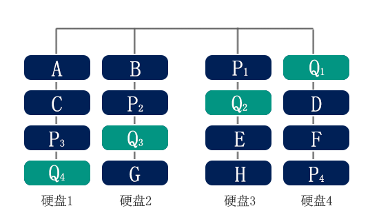 3、如果某个条带中丢失的两块数据是Q和A,那么可以根据校验P计算出A的数据。