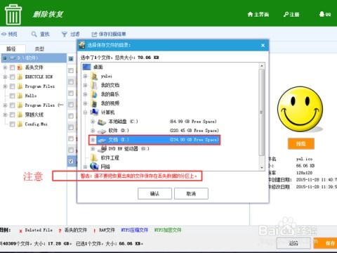 6. 选择保存路径:在弹出的窗口中,选择一个安全的路径来保存恢复的文件。记得不要选择与原磁盘相同的分区,以免覆盖掉其他数据。