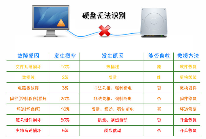 硬盘(移动硬盘)无法识别是一类极为常见,且发生范围又非常广泛的故障,上述表格将可能造成硬盘无法识别的原因一一列举,本文教您如何排查此类故障,并采取有针对性的数据保护措施。